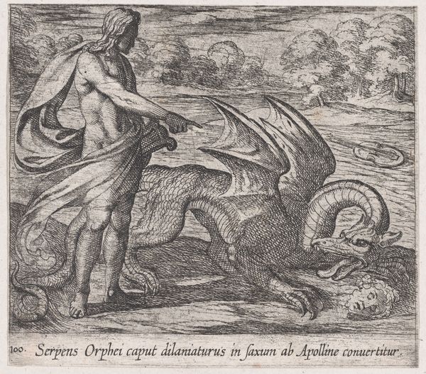 Editor: Here we have Antonio Tempesta's "Meleager Offering Atalanta the Head of the Boar." It's a small, detailed print. What strikes me is the rather formal presentation of such a gruesome trophy. What's your take? Curator: It's interesting to consider how this print, and others like it, circulated within a 16th and 17th century context. Prints played a crucial role in disseminating classical narratives and shaping cultural values. How does Tempesta's visualization reinforce or challenge established societal norms through its depiction of gender and heroism? Editor: I hadn't thought of it that way. It does seem to be emphasizing the power dynamics. Curator: Exactly. The act of offering the boar's head isn't just a gesture of love or respect. It's also a statement about power, ownership, and the public role of art in constructing these narratives. I wonder what other stories Tempesta tells about gender in his other prints. Editor: It is a nice way to look at this print! Thank you for pointing that out.