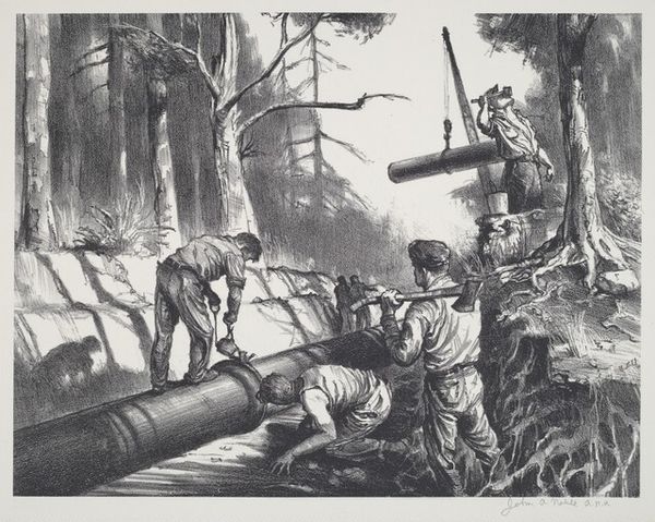 Editor: Here we have Edward Arthur Wilson’s print, *Untitled (Laying pipe in a New England town)* from 1945. The black and white imagery evokes a feeling of nostalgia, contrasting with the stark reality of the scene. What strikes you most about its visual construction? Curator: The image offers a captivating study in contrasts. Notice how Wilson orchestrates a play between light and shadow to articulate the forms. The heavy pipe is sharply rendered in great detail against the obscured pit below and the town behind, creating visual depth. Are you struck by that element too? Editor: Yes, I can see that now. The crispness of the machinery contrasts with the haziness of the background figures, giving the image dynamism and life despite its limited tonal range. What would you say is the most dominant compositional element? Curator: Undeniably the orthogonals—the converging lines created by the pipes, crane, and ditch. This forces our perspective deeper into the image. Furthermore, this technique is reinforced with the repetition of circular and vertical forms and balances the overall asymmetrical composition. It reveals a sophisticated approach to pictorial space. Editor: So, beyond the depiction of work, you are highlighting the underlying visual architecture that elevates this image? Curator: Precisely. Through compositional tools like line and value, Wilson’s artwork provides aesthetic engagement and thought. What did you gain through this close reading? Editor: I see the formal aspects much more clearly, which brings another dimension of meaning and detail I missed. Thank you.