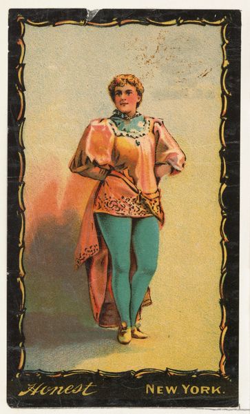 Curator: This is an advertisement card, "Actress in Costume", created by W. Duke, Sons & Co. sometime between 1884 and 1890. It was part of their Transparencies series promoting Honest Long Cut Tobacco. Editor: Immediately I notice the artificiality of the pose and attire; there is something quite melancholic about its constructed theatricality. It speaks volumes about idealized femininity for that period, especially its objectification by the male gaze. Curator: Precisely, notice how the composition emphasizes symmetry. The figure stands rigidly, centrally placed on a wooden pedestal. The artist meticulously renders her theatrical costume with a balanced color palette—red, green, and hints of gold against the background. Editor: But what narratives are constructed here? The figure becomes a vessel onto which desires and social anxieties are projected, a commodity like the tobacco itself. What’s honest about reducing a person to a spectacle to sell a product? How do such images play into our understanding of gender roles and labor within a burgeoning consumerist society? Curator: We could view her garment through the prism of aesthetic innovation; how the color work suggests artistic merit, while also understanding this through the context of commercial reproduction. She is elevated quite literally, and perhaps also metaphorically. Editor: Right, that very elevation reinforces societal hierarchies. The "honest" branding reeks of irony, positioning tobacco consumption – a habit often shrouded in socioeconomic complexities – with a veneer of trustworthiness. These advertising cards had the power to shape social consciousness about status, and even addiction. The subtle yet manipulative message of "Honest Long Cut" seems like a pointed critique. Curator: Indeed. This print reminds us how advertising cards – objects often dismissed as ephemera – can offer rich insights into our history. It's not merely about selling tobacco; it reflects the intricate intersection of art, commerce, and the human condition. Editor: By situating an artwork, such as this, in its multifaceted context, it exposes so much more than the image's surface aesthetics and opens conversations about the ethical quandaries in our pursuit of material culture.