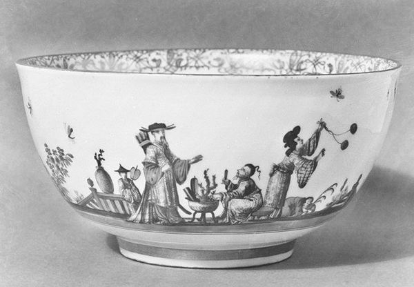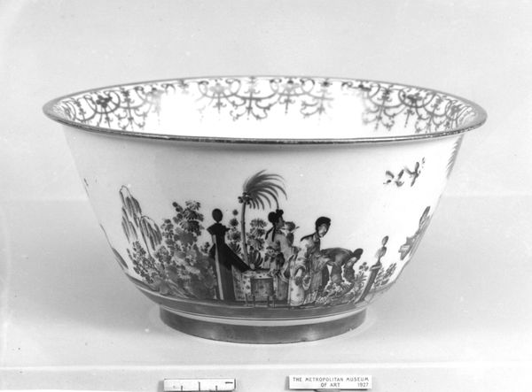 Curator: What we have before us is a porcelain bowl, a decorative piece dating from between 1720 and 1735. The artist is unknown, but its creation certainly fits within the Baroque tradition of the time. It resides here at the Metropolitan Museum of Art. Editor: Immediately, I feel a chill; it is an unusual monochromatic depiction on porcelain, something I typically associate with color. What about you? Does it strike you this way? Curator: You're right, the limited palette certainly contributes to that feeling! The scenes of the hunt wrap all around, playing out against what are almost ghostly landscape elements. It’s stark, but purposeful; maybe life and death weren’t as separate as we'd like to think during those times, or maybe porcelain painters just had limited pigments available! Editor: Observe the formal arrangement. We see dynamic groups and diagonal lines of energy—hunters, dogs, stags, all rendered with incredible precision in their movement. What could this hunt represent besides itself? Curator: On the one hand, you have what seems to be almost a rural scene. A simple activity, perhaps. But with closer examination, it reminds me of tapestries depicting the same subject—only those are celebrations of aristocracy and their divine right to the land. A dog is almost devouring one deer’s neck. It isn't for the faint of heart. Editor: There's also an interesting contrast in how different materials dictate form. With porcelain, the bowl's surface becomes the canvas. You have this convex plane that bends, distorts, and somehow animates these scenes as you move around them. And the continuous narrative almost creates its own temporal loop. Curator: Temporal loop… I love that! It suggests that despite the centuries, certain things—our fascination with nature, life, death, skill and the hunt—continue. This beautiful, somewhat chilling bowl kind of loops us back. Editor: Right, from a vessel used in a specific place and time, this bowl transforms time to become timeless in the halls of the Met.