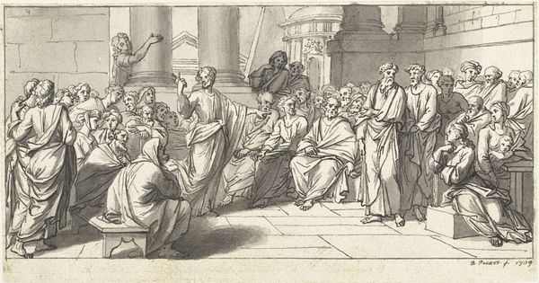 Curator: Julius Schnorr von Carolsfeld, a name as grand as the narratives he often depicted. This print, titled "David," likely created between 1854 and 1860, currently resides here at the Minneapolis Institute of Art. It’s a woodcut, so multiple impressions could be made. What strikes you about it initially? Editor: It feels so meticulously constructed, like a diorama of the Old Testament frozen in time. The precision of the lines, the almost photographic detail for a woodcut… it’s slightly unnerving, almost too perfect to convey genuine emotion. Curator: Well, Schnorr von Carolsfeld was working within a tradition that valued clarity and narrative. He was part of the Nazarene movement, and they looked back to medieval art for inspiration, which can be seen here. A fascination with history and religion are present throughout his work. We have King David playing the harp as inspiration seems to be delivered from above. But I imagine the means of producing something like this was intense. Think of the labor and skill needed to create such a detailed woodcut. It highlights a specific engagement with craft in an increasingly industrialized world. Editor: You are spot-on with craft. It’s funny, isn't it? We look at this and admire the precision, but I bet there's a hidden narrative in the artist’s own hand—the cuts, the revisions, the sheer physical effort etched into every line. One can almost hear the scraping sounds that resulted from the labor. Curator: Absolutely. The act of making is intrinsically linked to its message. And speaking of messages, there is an interesting dichotomy happening in the piece, where an historical depiction gets crafted for distribution to the masses. What does that suggest for your read of the image? Editor: Hmm, It almost feels like trying to bottle lightning. You're taking this wild, chaotic, deeply personal experience – King David in all his glory, the angelic visitations, whatever is driving the king – and you're reducing it to a repeatable image, fit for consumption. The whole idea of mass-produced spiritual art feels a bit oxymoronic, doesn't it? But there is something charming, something earnest about its effort. I admire Schnorr von Carolsfeld for trying, even if I don’t fully connect to the end result. Curator: It speaks to the complex relationship between faith, art, and technology during the mid-19th century. Editor: I agree completely. What a thought to leave us with... A beautiful way to consider process! Thank you for this perspective. Curator: Of course! Thank you for helping me think through this beautiful woodcut.
