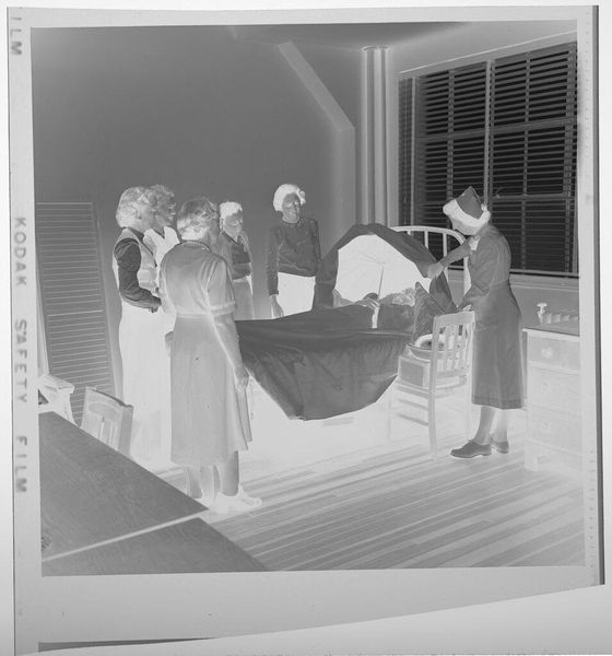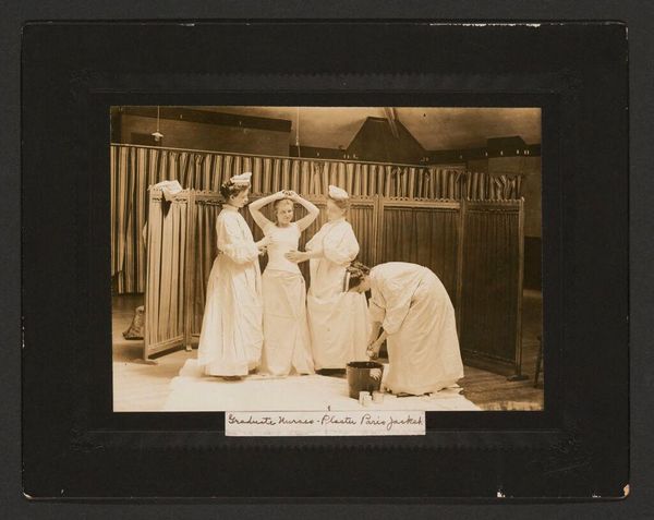 Curator: The composition is quite striking, isn't it? The verticality of the curtains against the horizontality of the bed creates a rigid order. Editor: Indeed. This Woodhead Studio image, titled "Defectives, Epileptics: United States. Massachusetts. Palmer. State Hospital for Epileptics: Bed Making," reveals a lot about the institutional labor and the conditions within. Curator: The starkness is what I see first—the monochrome palette and the way the light catches the pristine white linens. Editor: But those linens signify more than just cleanliness; they speak to the regimented lives, the repetitive tasks, and the attempt to control bodies deemed "defective." Curator: Perhaps, but the aesthetic choices also elicit a sense of sterile peace, a quiet, albeit unsettling, symmetry. Editor: I see it more as an attempt to erase individuality through the uniformity of labor, the making of beds a symbol of enforced order. Curator: I concede that the photograph is laden with social implications, yet the way Woodhead Studio captured this moment is visually captivating. Editor: Ultimately, I see a powerful documentation of an institution's methods and its impact on human lives.