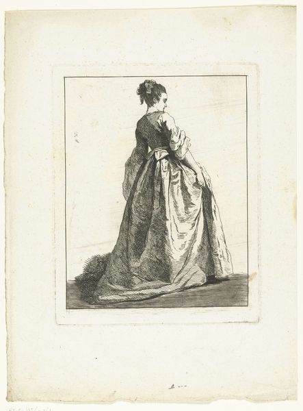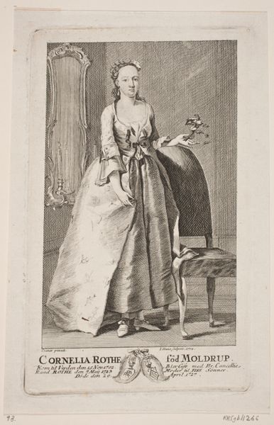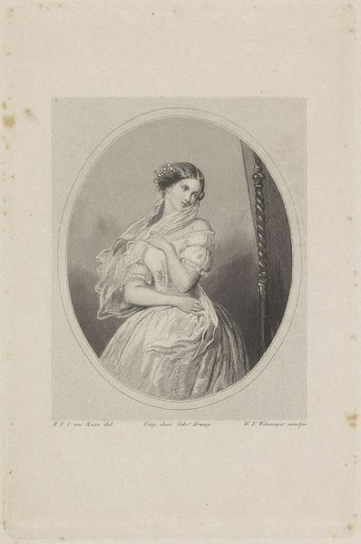 Curator: Here we have an engraving by Philippus Velijn, created around 1822. It's titled "Dame bij een tafel met een kistje en een kandelaar," or "Lady by a table with a box and a candlestick." Editor: The candlelight immediately sets a somber mood. The composition, with the figure almost blending into the background, gives her an aura of melancholy. Curator: Velijn’s Neoclassical style really emphasizes line and form here, doesn’t it? Notice how the drapery of her gown cascades in controlled folds. The tight hatching suggests a certain reserve, an emotional restraint quite typical for the era. Editor: And look at the imagery. Candlesticks, a small box perhaps containing secrets, and the portrait hanging in the background – likely a male figure who carries authority. All create a narrative that hints at introspection, longing, maybe even secrets or past regrets. Is she captive, I wonder, of societal expectations or personal grief? Curator: Intriguing interpretation! Technically, the engraving excels in contrasting textures: the smoothness of her skin against the rough background shading and the elaborate lace trimming of her dress. He clearly mastered light and shadow, adding depth and dimension, giving even the furniture a palpable presence. Editor: Exactly! Those elements work together to create an almost archetypal image of 19th-century femininity: beautiful but trapped within the gaze. The entire scene speaks of both vulnerability and strength; a woman amidst the quiet symbols of domestic life. Curator: Absolutely. Through composition and light alone, the engraving encapsulates a wider moment within that cultural milieu: the personal reflecting and informing the historical. Editor: Reflecting upon this artwork through this lens, the power of visual symbolism, particularly in historical photography or old engraving styles like this, gives viewers insight to the psychological landscape of its subjects. Curator: And looking closer into its technical structure, this engraving becomes an intricate study of both presence and absence. Editor: Indeed! The cultural nuances interwoven here are more intriguing than one may realize at first glance.