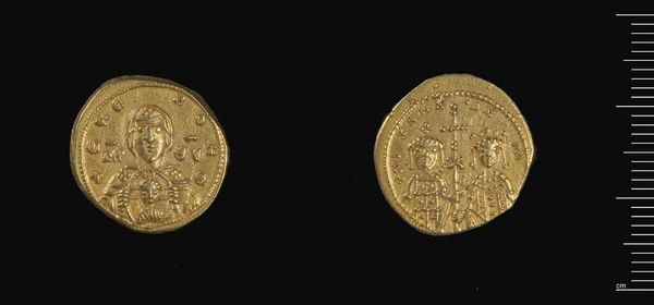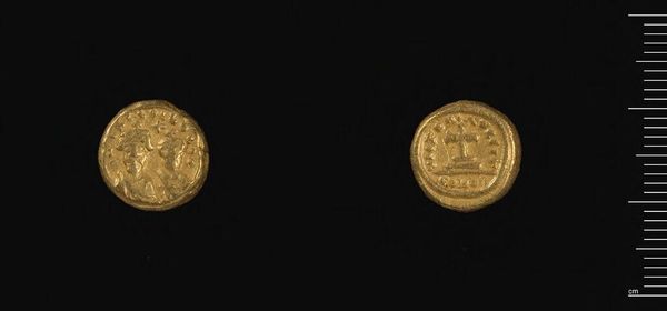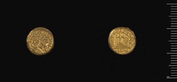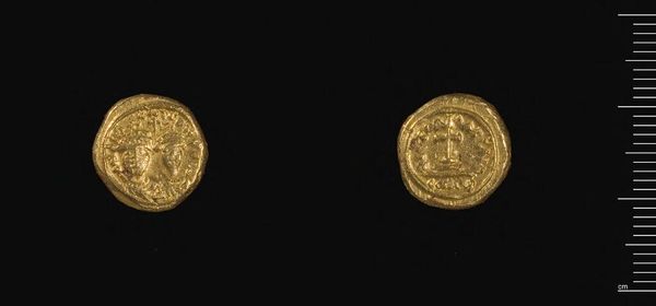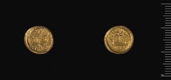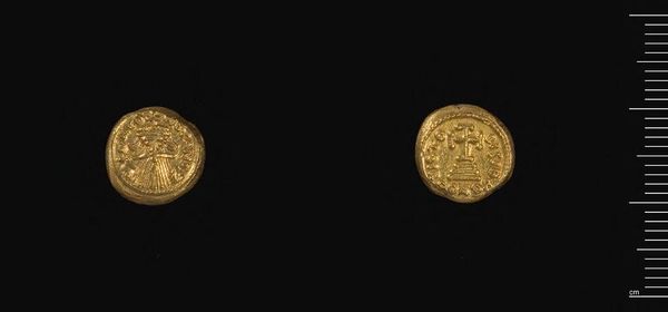 Editor: This is a gold coin of Herakleios, struck by Abd-al-Malik of the Umayyads. It's so small, yet so detailed! What does this coin tell us about the means of production during this era? Curator: The materiality speaks volumes. Gold signifies wealth and power, but its sourcing and processing involved exploitative labor. Abd-al-Malik’s repurposing of Byzantine coinage challenges established power structures, questioning traditional art boundaries through economic means. Notice how the imagery itself becomes a contested site of production and value. Editor: So, the coin is more than just currency; it is a statement? Curator: Precisely! It's a material assertion of dominance and an early form of economic warfare through controlling symbolic representation and, crucially, its tangible form. Editor: I see now how something so small reflects such large power dynamics!