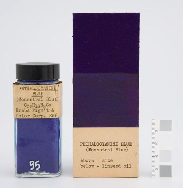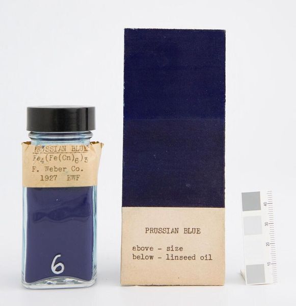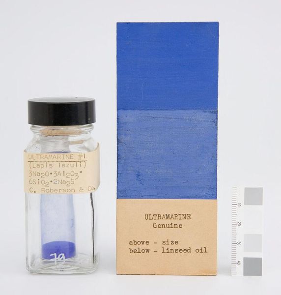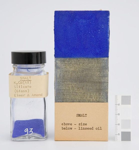 Editor: Here we have "Ultramarine #4 (Lapis Lazuli) Genuine," a manufactured pigment sample by Charles Roberson and Co. The pureness of the blue is striking. What do you see in the composition and color? Curator: The formal arrangement—jar, pigment block, and measuring scale—presents a study in color theory and material properties. The ultramarine, derived from lapis lazuli, displays an unparalleled intensity. How does the juxtaposition of natural pigment and manufactured presentation affect your perception? Editor: I suppose the manufactured presentation highlights the pigment's inherent beauty, making us appreciate its value as an artistic medium. Curator: Precisely. Its very essence. The systematic arrangement emphasizes the inherent qualities of the color itself. A meditation, perhaps, on color's pure form. Editor: I hadn’t considered the composition in that way. Thanks for pointing that out!