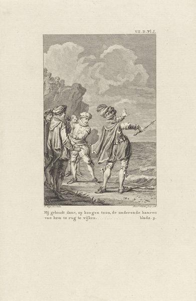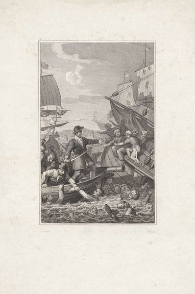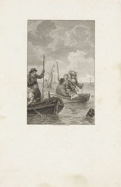 Editor: Here we have "Bathing Men and Hunters," a print etched by Romeyn de Hooghe sometime between 1655 and 1708. What strikes me most is the contrast between the meticulously rendered figures and the rather loosely defined background. How do you interpret the compositional elements in this piece? Curator: Note the stark contrast in the textures achieved through the etching technique. The foreground figures display a rich layering of lines to create depth and volume, drawing our eye immediately to their activities. The distribution of dark and light contributes to an evident hierarchy, subtly dictating where the eye should rest. The landscape's lines, however, are notably more sparse. Do you perceive a purpose in this disparity of detail? Editor: I'm guessing it is the suggestion of depth in the scene. Focus and sharper detail create nearness. This print shares aspects with genre paintings from the same period in the Netherlands. So how much is this related to art theory from this time, or is it more like just the result of what buyers appreciated? Curator: Genre painting offered artists freedom in composition, as evidenced by the strong horizontal and vertical organization. Also, there's the artist's meticulous treatment of line, a feature reminiscent of Baroque ideals in other media like sculpture and architecture. Editor: Ah, interesting. Thanks for helping me appreciate the artist's choices in this composition. Curator: Indeed. Reflecting on how this artist engaged in this technique sheds light on art historical approaches to subject matter, formal decision making, and social commentary.