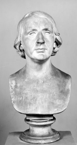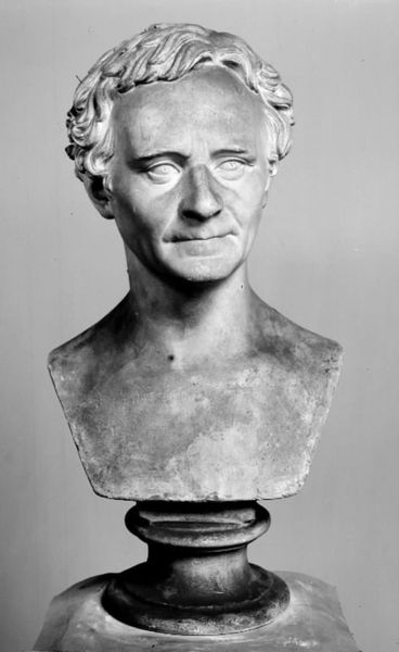 Editor: This marble sculpture, "The Poet Henrik Hertz," created in 1866 by H.W. Bissen, feels incredibly formal. It's a powerful bust, but also somewhat reserved. How do you read this piece? Curator: Formally, the piece strikes me as a study in contrasts. Consider the interplay between the smooth, almost polished surfaces of the face and the roughly textured hair. Bissen's treatment of light is also notable. Do you observe how the subtle gradations across the cheekbones and forehead give the face depth and volume, whereas the drapery appears less articulated? Editor: I do, and it brings out such complexity. Does the emphasis on his features lend any particular emphasis on his life? Curator: I would posit instead that such representational touches work as rhetorical devices within the larger semiotic system of neoclassical sculpture. His slightly furrowed brow and pursed lips seem less indicative of a psychological state and more evocative of the gravitas associated with intellectual pursuits during that period. Do you agree with this interpretation? Editor: That makes sense. So, you're saying it's more about conveying a certain image than capturing an individual’s true essence. Curator: Precisely. In other words, by carefully controlling texture, light, and pose, the sculptor has produced an iconographic representation of a poet—a carefully constructed symbolic form. Editor: I'm starting to see that. Thanks. Curator: Of course. Looking closer reveals so much about the conscious artistic choices at play.