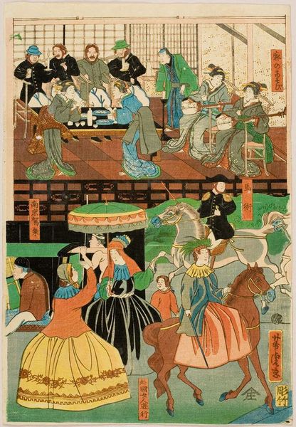 Curator: This print, "Interior of a Yoshiwara Tea House" by Katsushika Hokusai, captures a vibrant scene. The dimensions are roughly 37 by 25 centimeters. Editor: It feels so dynamic, almost like a snapshot. The composition is fascinating, with all those figures leading the eye. Curator: Hokusai's use of line is incredible. He defines space and form with such precision. You can almost feel the texture of the woodblock prints. Editor: Precisely, and the social context is really present here. One sees the workers and the goods that constitute the Yoshiwara. Curator: I agree. It’s interesting to consider how the materials available to Hokusai, and the labor involved in creating the print, shaped the final artwork. Editor: Yes, the convergence of formal design and labor is so fascinating. Curator: Indeed, it makes one consider these historical prints through their visual and material realities.