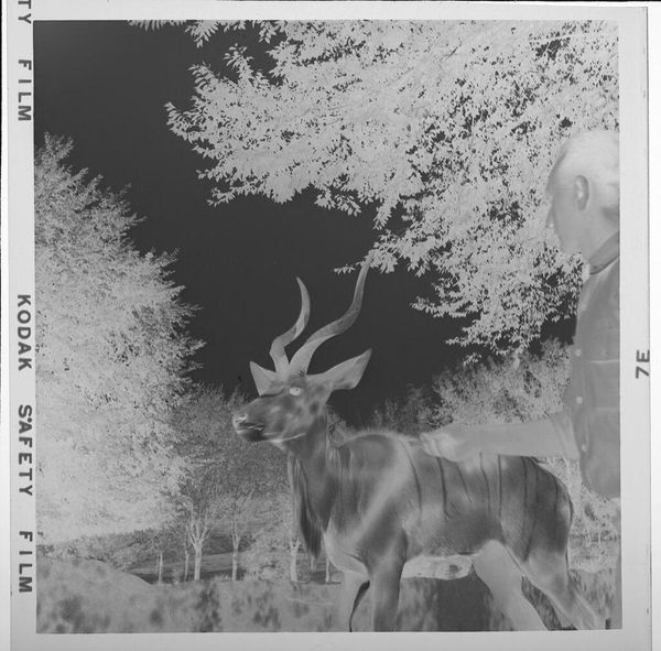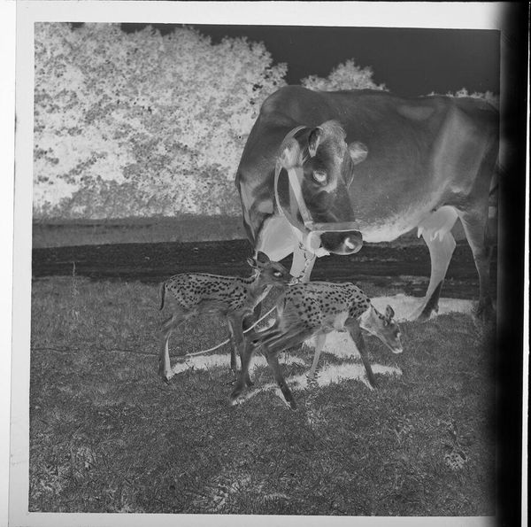 Editor: Here we have Jack Gould's "Untitled (baby fawns and cow)." It's a small, black and white photograph that presents this unusual juxtaposition of domestic and wild animals. What symbols or meanings do you find embedded within it? Curator: The cow, often a symbol of maternal nurturing and pastoral stability, is set against the seemingly incongruous image of fawns. This juxtaposition highlights the tension between cultivated nature and the wilderness. What happens when those boundaries blur in our memory and imagination? Editor: That's a great point. So, this image plays with our ideas about nature and how we categorize it? Curator: Precisely. It calls us to examine how we impose order and meaning onto the natural world. What does this photograph reveal about our relationship to animals and the stories we weave around them? Editor: Thank you; I'll definitely look at this piece differently now. Curator: Likewise; it’s a rewarding glimpse into how symbols shape our understanding.