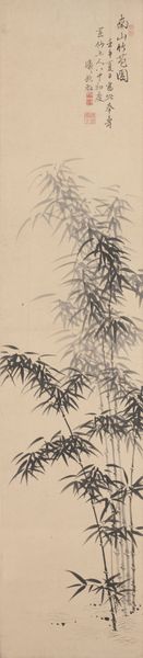 Curator: This hanging scroll, created around the mid-19th century, showcases bamboo and plum blossoms in ink on paper. It’s by Fujimoto Tesseki and currently resides here at the Minneapolis Institute of Art. Editor: There's a striking simplicity to it. The sparse strokes, the monochrome palette, create a mood of serene contemplation, wouldn't you agree? Almost like a visual haiku. Curator: Absolutely. Bamboo, of course, represents resilience and flexibility in the face of adversity, while the plum blossom signals the coming of spring, of renewal. Both powerful symbols within Japanese art and culture. Tesseki is evoking, therefore, the promise of hope even in bleak times. Editor: It makes one consider the socio-political climate of Japan at the time, too. The late Edo period was marked by both cultural flourishing and growing internal instability as the country faced increasing pressure from the West to open up its borders. So an image focusing on themes of renewal and resilience is particularly meaningful. Was this work commissioned, or intended for a wider audience? Curator: It is highly likely this piece, given its sophisticated calligraphy, was made for a well-educated literati circle who deeply understood its symbolism. Consider how line quality here shapes the feel of the entire work: from sharp, energetic lines that capture the bamboo's strength, to soft and flowing strokes bringing out the delicacy of the plum blossoms. Even its monochrome nature reflects the artist's emphasis on essential form. Editor: It certainly invites us to contemplate not only the subject matter itself, but also the values of Japanese society during this transitional era. We can also note how the composition reflects certain artistic principles: the intentional use of empty space and the asymmetrical balance. I suppose there are ways that social norms become visually manifested in painting like this. Curator: Indeed, the work's apparent simplicity contains layers of meaning accessible through knowledge of cultural memory and its visual symbols. Editor: Seeing how social narratives subtly weave into the visual fabric of art certainly deepens the viewing experience.