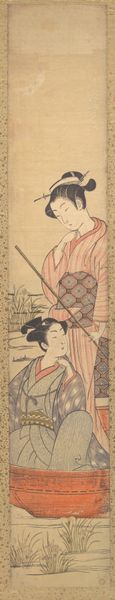 Torii Kiyohiro created this woodblock print, "Trimming Her Nails," during the mid-18th century, in a time when Japanese society was highly stratified, and the floating world of the "ukiyo" prints offered a space for imagining different social and personal realities. Here, we see a woman in a state of undress, seated on what appears to be a low, tiled structure, carefully attending to her nails. Her exposed skin and relaxed posture challenge the strict social norms of modesty for women, offering a glimpse into a private moment. The intimate act of grooming is set against the backdrop of a willow tree, a symbol often associated with femininity and grace, yet its presence here complicates the traditional representation of women. Kiyohiro invites us to consider the tension between the idealized image of women in art and the everyday realities of their lives. Through this image, we might reflect on the ways gender, class, and personal identity intersect in the creation and reception of art.