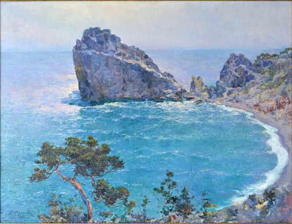 Editor: Here we have Claude Monet's "Rocky Point at Port-Goulphar," painted in 1886. It’s an oil painting that feels incredibly raw, the brushstrokes thick and almost violent. The colours are muted, but intense, it’s very striking. What is your take on this piece? Curator: Ah, Monet! This painting... it breathes, doesn't it? I feel the salty wind and hear the waves crashing. He painted it en plein air on Belle-Île, which literally translates to “beautiful island”, which I feel has become a character in the piece, no? Look how the pink sky dances with the rugged, defiant cliffs, it makes one ponder that feeling of both peace and chaos, beauty and indifference. What do you think it suggests about our place in the world? Editor: That’s beautiful! It definitely evokes that kind of sublime, like you are this small figure up against a powerful landscape. The Romantic in me really connects with it! Curator: Exactly. Monet captures that very essence, doesn't he? He’s not just showing us a place, he’s making us *feel* it. What do you think he was trying to evoke in painting on site instead of a studio? Editor: Maybe to really understand the raw energy you spoke about earlier, be there as the elements crashed on and around him... Almost fighting with the canvas. Curator: Yes, and it's almost as if the landscape is telling its own story! Did our conversation shift how you now see the painting? Editor: Absolutely, I can see much more the subtle elements that make up this emotional painting! Thank you! Curator: Likewise! It’s always a pleasure to find new corners in familiar places.
