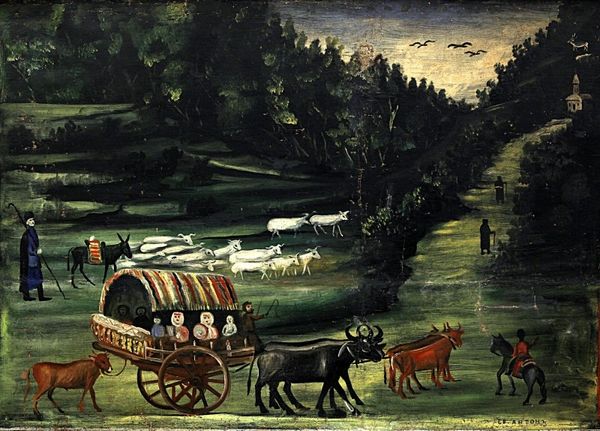 Henri Rousseau made "Old Man Juniet's Trap" with oil on canvas, and it's a whole world, all its own. The paint here is so flat and deliberate, it's like each shape is asserting its right to exist, without blending or fuss. Look at that horse – a creature built from simple, careful strokes, with an almost ghostly presence. You can practically feel Rousseau figuring it out as he goes. The colors are so contained and solid; the black of the outfits, the orange of the wheels, the white of the horse, and the brushstrokes are visible, raw, and honest. Rousseau, like many artists, wasn't afraid to just put it all out there, the real and the imagined. He reminds me of someone like Florine Stettheimer, who also created these quirky, self-contained worlds. They are embracing the weird and the wonderful, and making art a space for their own kind of storytelling.