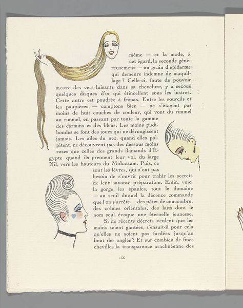 E. Ayres created "Gazette du Bon Ton, 1914 - No. 5, pag. 157: La Palette des Dames" using a printmaking process. The Gazette du Bon Ton, a short-lived but influential French fashion magazine, was published between 1912-1925. Published on the eve of the First World War, the magazine offered an escapist fantasy for the wealthy at a time of increasing social unrest in Europe. Ayres's print speaks to the cultural moment by reflecting the intersection of fashion, art, and female identity during the early 20th century. In the print, the text makes many references to women and the arts, such as mentioning conferences in Sorbonne, and the decoration of faces following the traditions of Monomotapa. The Gazette promoted an elitist vision of femininity and beauty, reflective of a society on the brink of dramatic change. The reference to women and their artistic capabilities challenges traditional representations, envisioning new narratives of female expression and empowerment.