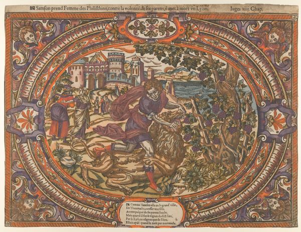 Editor: So, this is *Angel announcing the Birth of Samson, from the Story of Samson*, made between 1555 and 1585. It's currently at the Met, and it's a drawing, an engraving. It looks like pen, colored pencil, maybe other things too. It strikes me as very busy, with all the figures and that intense border. What do you see in this piece? Curator: Beyond the immediately visible scene, consider this artwork as a site of cultural negotiation. During the Northern Renaissance, images like these were circulated widely through prints, contributing to evolving perceptions of power, gender roles, and religious authority. How do we interpret the angel's message in the context of the subjugation of Israel by the Philistines, suggested by the inscription? Editor: I hadn't really considered the political element; I was more focused on the family aspect, but you’re right, the inscription definitely adds a layer. Curator: Exactly. Look at how the figures of Manoah and his wife are positioned in relation to the angel and the altar. How might this arrangement reflect the anxieties surrounding female agency and patriarchal control within 16th-century society? And the angel – an intersex figure between male and female… What can we make of that? Editor: I guess the artist is suggesting that divine power transcends gender norms? Curator: Possibly. The story of Samson itself is rife with complexities concerning masculinity, violence, and liberation. Reflecting on the context, how does the image reinforce or subvert these contemporary societal norms of the period, particularly around resistance and identity? Editor: I see what you mean. Thinking about it this way opens up so many more questions about the artwork and the time it was made. Curator: Precisely! Art isn’t just about aesthetics; it's about engaging in a critical dialogue with the past, allowing us to re-examine our own present.