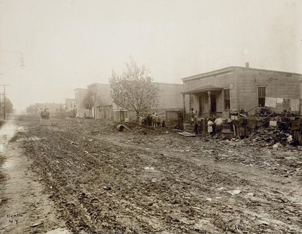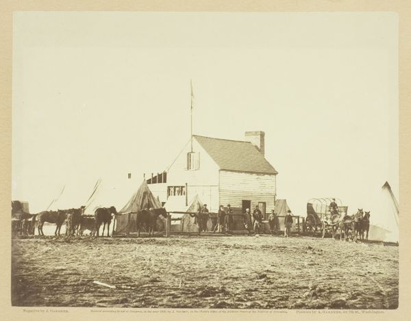 Curator: This gelatin-silver print, taken sometime between 1861 and 1865, is entitled "[Yellow House [also known as Yellow Tavern], Headquarters of the 6th Army Corps, Warren Station, in Front of Petersburg, Virginia]". The photographer was Timothy O'Sullivan. Editor: Stark. Utterly stark. It feels barren, like a stage set after the play’s finished, the actors gone. And that yellow house... it’s bleached of all color, practically disappears into the background. What kind of stories could those walls tell? Curator: O’Sullivan’s work is so compelling because it moves beyond the heroic narratives of war. While commissioned to document the conflict, his lens captured the human cost, the environmental devastation. Consider the image’s context: Petersburg was a vital railway hub and its siege one of the longest in US history. This “yellow house” wasn’t just a landmark; it was the strategic heart of the Union's Sixth Army Corps. Editor: It’s almost unnerving how ordinary the house looks given its place in history. The almost mundane tableau is disrupted by this intense feeling of emptiness. The figures seem so insignificant amidst all of that empty landscape; the human element shrinks. And is that supposed to be cheerful? The yellow seems to signify so many awful things. Curator: Exactly. The flatness of the composition, the near-absence of dramatic shadow, removes the romanticism often associated with depictions of war. O'Sullivan doesn’t judge; he presents. It invites us, or rather demands us, to question what's missing, and what power structures underpinned such a conflict. Who benefited? Who suffered? Editor: The photo almost resists easy interpretation, which I love. The bleak landscape pushes one to ask bigger questions; to see beyond the romantic and dive straight into the muck and the mire of it all. There is some poetic in seeing a house so seemingly small, which once played such a huge part of what came to pass. A lasting reminder, for all of us. Curator: Precisely, by moving past merely commemorating victory, O’Sullivan provides viewers with an enduring artifact prompting vital national conversations regarding memory, loss, and accountability. It leaves a chilling echo. Editor: An echo we still feel today, resonating through every crack and broken board of that yellow house.