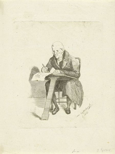 Editor: Here we have J.F. Clemens's etching, "En herre ved et skrivebord," dating sometime between 1748 and 1831. The scene is simple: a man at a desk. He seems to be in deep thought. What social narratives might this piece engage with? Curator: I see a study in the construction of masculinity and power. Note the upward gaze – is it aspiration, divine inspiration, or something else entirely? Consider the era. This piece exists within a complex matrix of class, privilege, and the Enlightenment ideal of the rational man. How might the tools of writing – the desk, ink, and quill – symbolize the agency afforded to him, an agency denied to so many others based on gender and class at the time? Editor: That’s fascinating. I hadn't considered the symbolism of the writing implements in that way. Do you think the lack of background detail adds to this reading? Curator: Precisely! The starkness amplifies the figure. It thrusts his actions and his perceived intellect into the spotlight, demanding we analyze not just the "what," but the "who" and the "why" behind the image's construction. Think about what narratives are deliberately omitted. Where are the women? Where are those from lower classes, without such clear power and authority? Editor: So it's almost like a commentary on who gets to be represented and how? Curator: Exactly. And whose stories remain untold. We need to view these works critically. What’s included, and just as importantly, what’s excluded from the visual frame. Editor: I’ve learned that there can be multiple viewpoints in one image, based on how it reflects gender, authority and background in this etching. Curator: Precisely, and remembering that acknowledging those complex perspectives are so important to how we understand visual art.