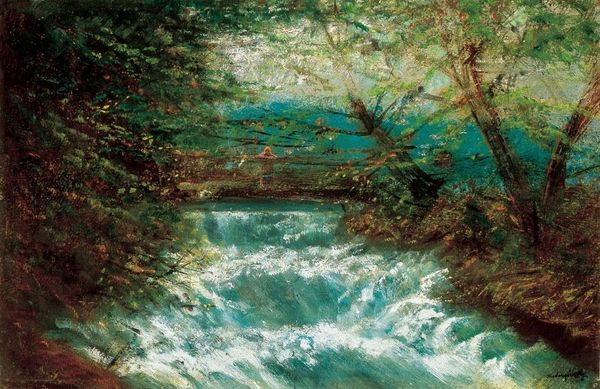 Curator: Looking at this scene, I immediately sense the force of nature, all that white water tumbling toward us. It is very dynamic and slightly overwhelming. Editor: That's a perceptive observation. This is "Burring Brook with Bridge," by Laszlo Mednyanszky. We don’t have a specific date, but he’s well known for his landscape painting created *en plein air*. You can sense his focus on quickly capturing natural light in fleeting moments, very characteristic of the Impressionist movement. Curator: That immediacy explains the feeling, almost like a dream or a half-formed memory of being in that spot. The bridge is interesting. There are, perhaps, two indistinct figures on the bridge, very sketchy and blurred into the landscape; who are they? I feel they are crucial to reading the landscape. Editor: Mednyanszky spent a lot of time examining landscape's relationship to the human figure, particularly figures on the margins. While not rendered with clarity, their inclusion shifts the focus beyond merely aesthetic appreciation, and suggests contemplation, observation, or some kind of psychological reflection. Curator: I understand that, but the water is more insistent. Symbolically, the surging, frothy water is far more dramatic; one has to negotiate with its flow. Does this refer to Hungarian society in the early part of the 20th century and all the social change underway at that time? Editor: Possibly. Landscape paintings of the 19th and 20th century did serve as mirrors for society. They weren't only idyllic visions of the countryside; instead, they often captured anxieties related to modernization. His figures, like that bridge, occupy this intermediary space. Is it a symbol of connection? Or an artificial division between viewer and landscape? Curator: It has a powerful liminal quality, neither quite here nor there. The white water speaks of emotional overwhelm, I see both the individual’s and society's fear in it. Perhaps the figures on the bridge suggest how humanity finds balance, observing that powerful, churning force? Editor: That's a beautiful synthesis, I must say! Bringing us closer to how the personal, the social, and the elemental forces converge in Mednyanszky's art. Curator: Yes. Seeing the world as forces within and without constantly interchanging, both destructive and restorative.