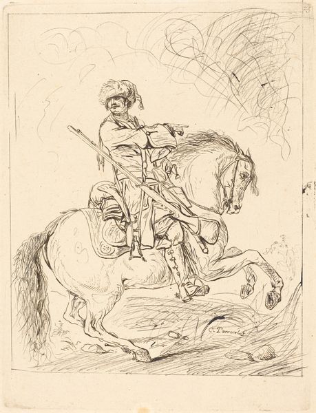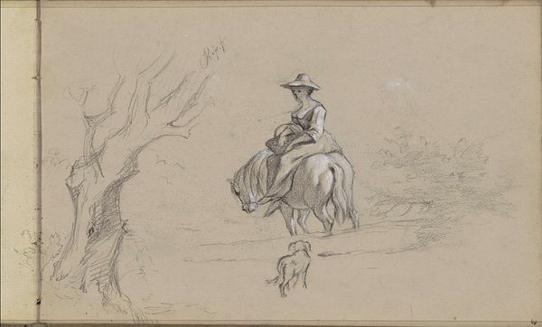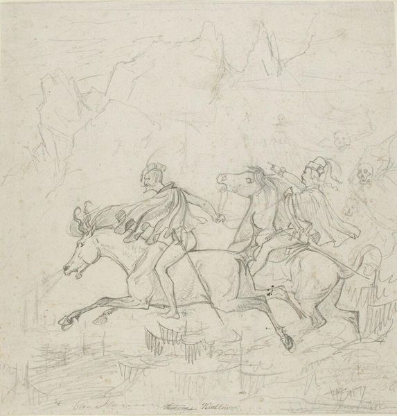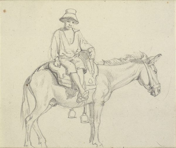 Editor: We’re looking at "Ruiter," a pencil drawing by Charles Rochussen, made around 1840 to 1860 and currently held in the Rijksmuseum. I'm struck by how light and airy it feels, despite being a fairly traditional equestrian portrait. What do you see in this piece that stands out in terms of its composition? Curator: Indeed, the lightness is remarkable, stemming from Rochussen's masterful use of line and tone. Observe the interplay of hatching and cross-hatching; this is not merely representational, it is structural. Note the way the artist’s purposeful mark-making defines the form and volume of both the rider and the horse. How might we consider this mark-making, not simply as description, but as language? Editor: That’s a great point. The varying density of the pencil lines creates a sense of depth, almost like a grayscale painting. Does the rather indistinct landscape play a role in the structure as well? Curator: Precisely. The vagueness of the landscape foregrounds the figures, highlighting the artist's focus. Consider how the contrast between the detailed figures and the undefined background forces the viewer's eye, establishing a visual hierarchy. Could this suggest a relationship between power and background, presence and absence? Editor: That's a very interesting lens. I hadn’t thought about the "unfinished" quality contributing to that kind of reading. It feels very deliberate now that you mention it. Curator: Exactly. Rochussen’s approach invites a reading where the seemingly incomplete becomes a deliberate part of the overall form. Considering the formal elements allows for greater insight into artistic intention. Editor: I appreciate you highlighting the importance of line and tonal variation here. I am looking at the artwork through fresh eyes. Curator: The intrinsic qualities of the work offer rich insights into not only artistic skill, but also intent. Keep in mind the power of purely visual investigation when facing a work of art.