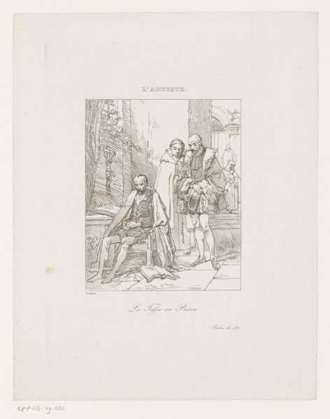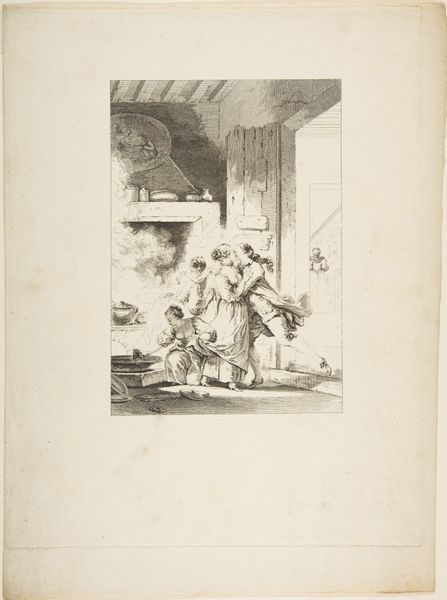 Curator: Immediately, there's a dramatic intensity despite the small scale. The bold lines and chiaroscuro effects lend the composition a surprising weight. Editor: Here we have Hermann Weyer's "Venus in Vulcan's Forge," a drawing created around 1607, currently residing here at The Art Institute of Chicago. It's pen, ink and etching on paper, depicting a scene rife with symbolic potential. Curator: Symbolic, certainly, but visually striking as well. The strong diagonal created by Venus's extended arm, balanced by the weight of Vulcan, produces a compelling dynamic tension. What is going on culturally at this time that contributes to its creation? Editor: Well, during the late Renaissance, allegories were very popular in art, so here you see Venus, the goddess of love, visiting Vulcan, the god of the forge. The setting itself is significant – the forge represents labor, transformation, even the alchemical process, ideas that artists of the era found compelling to depict. And the tension! Venus appears almost forceful in this interpretation. Curator: Yes, there’s that wonderful contrast. Her gesture seems to subdue the smith as he is seated. Cupid, there on the side, and is even sitting on what seems to be a cannon! Editor: Indeed. We might see it as a commentary on power dynamics within relationships, perhaps reflecting shifting social structures where traditional roles were being challenged, even questioned. Notice also the architecture represented and the library in the window. A strong statement on their union of beauty, love and intelligence, physical labor, knowledge, and weaponry! Curator: I appreciate your view, but what resonates for me are the artist's mastery of line, the way the ink washes create depth and volume. This formal achievement speaks volumes. Its historical importance cannot overshadow the purely aesthetic merits of this image. Editor: I concede that there's no denying the skill, even though as historians, we cannot ignore context. Perhaps we are drawn in by the inherent tensions present within the overall makeup of its allegorical theme. What do you think the viewers might think in years to come? Curator: I trust that it's a beautiful object, whose lines will continue to charm future generations with its own inherent vitality, standing in stark contrast to other contemporary examples.