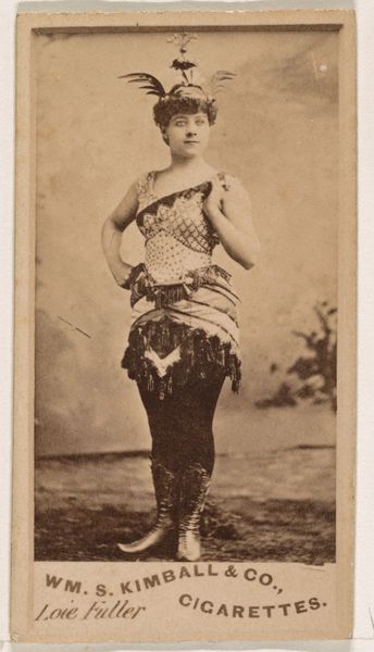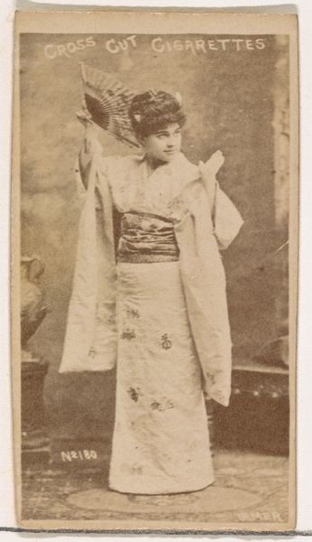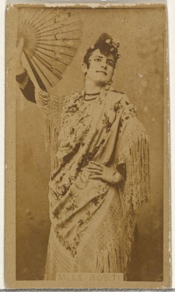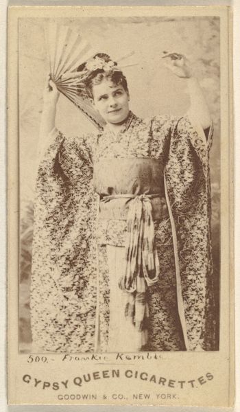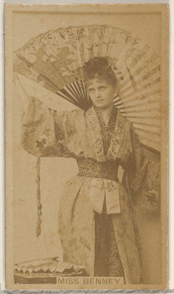 This small portrait of Miss Benney, part of a series of actors and actresses, was created as a cigarette card. What immediately strikes the eye is the prominent fan. For centuries, fans have been symbolic objects, especially in the East, often associated with royalty and theatrical performance. The fan's ability to conceal and reveal echoes the performative nature of theater itself, suggesting a play of identity. It can be traced back to ancient rituals, where masks and veils were used to transform identity and evoke the presence of spirits. Like the masks in ancient Greek theater, the fan here acts as a symbolic extension of the performer’s persona, adding an emotional layer that transcends mere representation. This recalls the cyclical nature of symbols, forever resurfacing and evolving.
