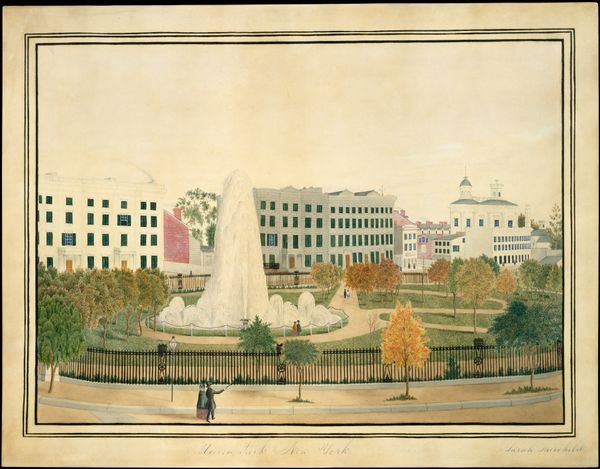 Curator: Here we have an untitled watercolor painting and drawing believed to be from around the 19th century by an anonymous artist. You can find it here at the Minneapolis Institute of Art. Editor: It has such a charming awkwardness! A dreamlike quality to the proportions. Are we sure it’s not a memory palace or the artist’s longing distilled into form? Curator: The artist certainly leaned into their own visual language. It’s an example of folk or naïve art. Look at the way the buildings are rendered. Editor: The architectural symbols! Notice how the structures take center stage, rendered with almost reverent attention. Are these government buildings? Educational institutions? Their imposing facades certainly project a sense of established power. The garden seems almost secondary, a decorative fringe to these monoliths of… what exactly? Curator: Considering the period, possibly a college campus. Think of the role of institutions and how they shape identity. The style itself emphasizes clarity, directness. Even the black decorative framing around the edges lends to this effect. It reminds me of certain primitive portraits, but translated into architectural form. Editor: Yes, there's almost an insistence on linear perspective, but it’s wonderfully subverted. See how the foreground garden tilts up, creating this wonderfully surreal stage. I wonder if the artist ever thought this ‘awkwardness’ would be appreciated like this centuries later! Curator: Absolutely! It feels fresh and defies expectation. To me it really embodies a beautiful collision between observed reality and a purely subjective vision. What else sticks out? Editor: The flags flying atop each building-- they give it an official or patriotic feeling. It speaks to themes of nationhood, education, and perhaps civic pride. Though I suspect this piece hides so much of its secret intentions from us. Curator: Perhaps. Regardless, I find that pieces like this often invite us to re-examine our assumptions of skill and expression. There is a power to this 'naive' approach! Editor: Agreed. It certainly allows the soul of the subject to shine through. This artwork acts as a kind of mirror, showing us something new about ourselves and how we respond to art's myriad forms.