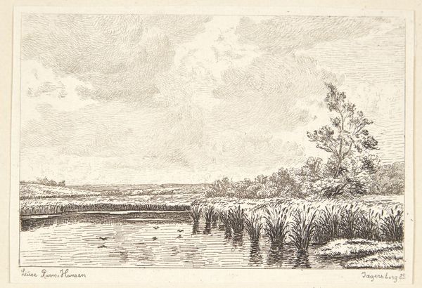 Charles Jacque made this landscape near Asnières using etching, a printmaking technique, sometime in the mid-19th century. During this period, rapid industrialization was transforming the French countryside, raising questions about the relationship between nature and society. Through its visual codes, this etching speaks to broader cultural anxieties about modernization. We can see the artist's approach to the rapid changes in French society. The way the image is composed, with its tranquil river and verdant banks, creates a sense of harmony and balance that contrasts with the industrialization occurring at the time. Understanding the art of this period means exploring the social and institutional forces shaping artistic production. By consulting historical documents, critical essays, and biographical accounts, we can gain insight into the social, cultural, and political contexts that informed its creation.