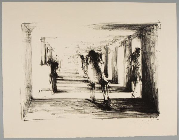 Curator: Michael Mazur's, "The Occupant, Plate III," presents an unsettling scene, rendered in stark monochrome. Editor: Immediately, I’m struck by the raw energy in those lines—the way they build form but also dissolve into pure texture. There's a real sense of claustrophobia. Curator: Mazur often focused on themes of confinement and mental distress. The "Occupant" series likely reflects his deep engagement with issues of social marginalization and the psychological impact of institutionalization. Editor: And the figure itself, hunched over, nearly swallowed by shadow—the composition pushes us to consider the internal state, perhaps as much as the external circumstances. It’s quite powerful. Curator: It's a reminder of art's role in giving voice to the voiceless, and prompting reflection on the way we treat the vulnerable. Editor: Yes, the formal choices magnify that impact; the contrast, the line work – it all funnels our attention right into that feeling of isolation.