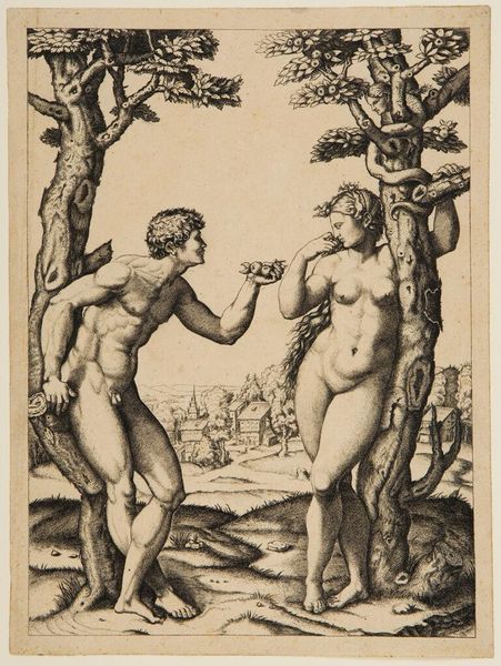Curator: Immediately striking. There's a tension, a poised stillness that precedes a momentous decision. The texture, especially the cross-hatching, gives depth and weight. Editor: We're looking at "Adam and Eve flanked by two trees, a town in the background," an engraving executed between 1507 and 1517 by Marcantonio Raimondi. It resides in the collection of the Metropolitan Museum of Art. What can you tell us about its materiality? Curator: Well, as an engraving, the image is literally etched into a metal plate, likely copper. Think of the immense labor that went into creating the dense network of lines to simulate light and shadow. It’s a reproducible medium, making the image accessible to a wider audience beyond the elite. Each print is evidence of labor. Editor: And formal elements such as line quality. Notice the precision, the variations in thickness used to define form and create volume. The contrapposto stance of both figures. It is a formal element of Renaissance art; Adam and Eve's sinuous positioning is typical. Curator: Right, and it's not just about aesthetics. Consider how these prints circulated – impacting social perceptions and knowledge of the biblical narrative. Who were the consumers of these images? How were they displayed, and what role did they play in shaping societal values or beliefs? Editor: Those Renaissance viewers would immediately pick up on how the serpentine forms emphasize tension and perhaps, that the forbidden fruit carries a potent visual meaning. It invites a slower read. Also, that Eden in a historical European setting could offer its audience an allegorical message. Curator: Definitely, but let’s think practically. An engraving like this offered a cheaper, reproducible means of disseminating the style and compositions of prominent artists. Raimondi helped broadcast artistic innovations, influencing countless other printmakers and artists beyond Rome. That accessibility changes art history. Editor: Ultimately, isn't it that precise rendering of form, the way light plays across those carefully delineated bodies, the elegant balance of the composition itself, that gives the piece its lasting power, regardless of social impact? Curator: Well, without considering the social impact, without discussing print and economy and distribution, wouldn't it be so flat to confine the message simply to what the image presents without any meaning in relation to the masses? Editor: Hmm... I see your point; my understanding deepens by appreciating those perspectives. Curator: And for me, seeing that attention to detail makes the print resonate beyond pure formalism is fascinating!