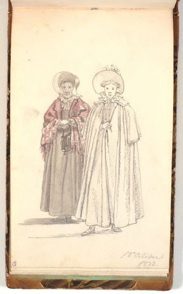 This watercolour, "Peasant Women from Ragusa" by Edward Lear captures figures and ethnographic observations on a single sheet. The composition, rather than presenting a complete scene, is fragmented, featuring sketches of women in traditional dress, annotations, and details of clothing. The figures are rendered with quick, fluid lines and washes of colour. The clothing, with its ornate patterns and textures, seems to invite us to decipher a cultural semiotic. Lear uses colour not to create realism, but to highlight specific details. The red fez-like hats, the blues and browns of the dresses, all stand out against the pale background, creating a chromatic structure. Lear's use of line and colour blurs the boundaries between observation and artistic interpretation. The annotations around the figures suggest an attempt to fix meaning and place the scene within a broader cultural context. The composition resists a singular, stable reading, inviting ongoing interpretation.