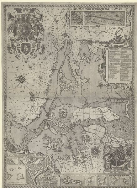 Curator: This print from 1632, titled "Grote kaart van het beleg van Maastricht, 1632, plaat 3," depicts the Siege of Maastricht. Salomon Savery rendered this intricate scene in etching and engraving. Editor: My initial impression is of calculated precision. There's an undeniable power dynamic visually represented in the landscape, a strategic dominance etched onto paper. Curator: Indeed. Savery employs line and texture to delineate the topographical details—notice how the meticulously rendered fortifications contrast with the organic sprawl of the surrounding countryside. Editor: But the seemingly objective cartography is loaded with socio-political messaging. Who commissioned this piece, and how did it function as a tool of power? The act of mapping itself becomes a form of conquest, claiming territory both physically and ideologically. Curator: Precisely. Look at the systematic arrangement of the fortresses, rendered as geometric shapes; Savery uses form to demonstrate the organizational capabilities of military power. These architectural structures dictate how our gaze travels through the composition, effectively showcasing militaristic advancements. Editor: I'm more concerned with the lived experiences of those within the mapped space. Where are the people? The map renders the space as passive to facilitate occupation, neglecting the reality of human inhabitants subject to militarized power, effectively silencing narratives of trauma. Curator: Perhaps the relative absence serves as a reminder of the consequences of warfare. This stark rendering, however, directs us back to Savery’s skilled use of engraving to communicate a three-dimensional space on a two-dimensional plane. The lines function to depict the light reflecting off surfaces within the represented landscape, resulting in a dynamic visual impact. Editor: So, as an objet d'art, Savery’s map exhibits his skills, but we need to acknowledge its role within an incredibly complex and often devastating period. As the technology evolved, these became ways of controlling the populace, too. Curator: I agree completely. Close study reveals a calculated composition; contextual exploration exposes embedded social dimensions. Editor: A synthesis is imperative; appreciating aesthetic skill need not preclude analysis of historical consequence.