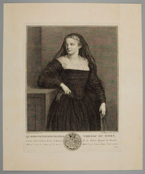 Editor: So this is “Vrouw met een donkere sluier” – “Woman with a Dark Veil” – an engraving by Francesco Villamena, dating from somewhere between 1576 and 1624. The precision of the engraving makes it seem austere. What stories do you think this piece could tell? Curator: Well, first consider the veil itself. In many early modern European contexts, veils weren't just fashion statements; they signified social standing, religious piety, or even marital status. So, we might ask: What does the dark veil communicate about this woman’s position within the power structures of her time? Is it a symbol of oppression, or could it also be a shield, a way of navigating a patriarchal society on her own terms? Editor: That’s interesting. I hadn’t thought about the veil having agency. It feels like she’s staring right at the viewer, challenging us. Curator: Exactly. The direct gaze is crucial. Does it project vulnerability, defiance, or something in between? Consider, too, that portraits like these were often commissioned. Who was she? Who commissioned the work, and what message were they trying to convey? Editor: So the meaning is less about the woman as an individual, and more about her as a representative of a specific social class or role? Curator: It’s both. It's about unpacking the tensions inherent in portraiture itself – the negotiation between individual identity and imposed social roles. How do you think it challenges contemporary notions of female identity? Editor: It makes me consider the different expectations women face today, and how those are represented, or misrepresented, in modern portraiture and media. The tools change, but perhaps some of the underlying issues of representation remain. Curator: Precisely. Engaging with these older works helps us critically examine the power dynamics still at play in visual culture today. It’s not just about art history; it’s about understanding the ongoing construction of identity.
