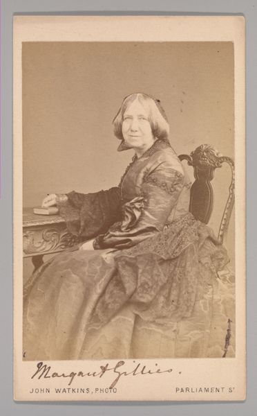 This is a photographic portrait of Julia Margaret Cameron by her son, Henry Herschel Hay Cameron. The sepia tones and soft focus lend the image a dreamlike quality, typical of photographic portraits from this era. The composition is structured around a delicate balance of light and shadow. Notice how the shawl draped around her shoulders draws attention to the subject's face, which is softly illuminated. The artist plays with textures—the smoothness of her skin against the plushness of the fur collar, the intricate patterns of the shawl contrasting with the plain backdrop. These choices aren't merely aesthetic. In the Victorian era, photography was beginning to challenge painting as a high art form. The use of soft focus and careful arrangements of fabrics and textures can be seen as an attempt to emulate and elevate the status of photography to that of painting. It's a negotiation between the mechanical precision of photography and the expressive potential of art. The photograph is not just a record, but an interpretation, an effort to capture not just likeness but presence.