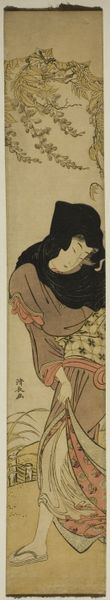 Curator: This is a print by Utagawa Kunisada, dating from the period between 1800 and 1865. It's currently held in the collection of the Metropolitan Museum of Art. Editor: My immediate reaction is the intensity of pattern! The whole scene buzzes with intricate designs, almost vibrating with visual energy. Curator: Kunisada was a leading printmaker of ukiyo-e, which flourished during the Edo period. Prints like these played a key role in disseminating popular culture, especially Kabuki theatre. This image seems to capture a Kabuki actor. Editor: Absolutely. Note the stylized makeup and the exaggerated pose. But it is the visual composition that grabs me: the juxtaposition of the kimono’s floral pattern against the geometric screen, the play of dark and light in the fabrics—each element carefully considered. The flatness is key as well; it is completely absent of standard depth, but it still works, beautifully, if a bit oddly. Curator: Precisely. These prints were vital in shaping celebrity culture. Actors became icons, influencing fashion and taste. Ukiyo-e allowed for wider circulation of imagery that previously remained exclusive. The patterns weren’t just decorative; they signified status and roles within society. The background evokes classic domestic scenes popular at the time. Editor: The detail in the objects placed above his head indicates wealth. This form emphasizes his rank or importance. Yet there's something also intentionally awkward about it, too, that naive art that gives the picture an aura of strange familiarity. The angularity with the curves creates a balanced effect of visual interest and subtle narrative intrigue, I'd say. Curator: A final consideration of these woodblock prints and their cultural value in providing access and education for the people. That they're still relevant speaks volumes of the time. Editor: Kunisada really packed an incredible amount into one flat plane. It creates a stunning image. The interplay of lines and shapes remains remarkably compelling.