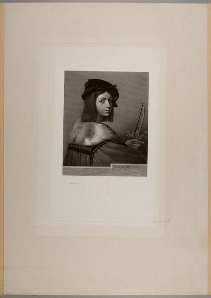 Curator: George Jakob Felsing created this print, "Raphael Sanzio d'Urbino", which resides here at the Harvard Art Museums. Editor: The monochromatic palette emphasizes the subject’s poised yet slightly aloof demeanor. The textures, fur against skin, are rendered with a striking precision. Curator: Felsing, although less known today, played a crucial role in disseminating knowledge of Renaissance masters. His prints made Raphael accessible to a broader public. Editor: Note how the delicate line work captures the soft fall of light on the face, guiding the viewer's gaze. Also, the inclusion of the MDXVII date, the year that Raphael died, suggests a memorial or a tribute. Curator: Indeed, it’s a fascinating example of how 19th-century printmaking shaped the canon of art history and influenced art appreciation. Editor: Yes, analyzing this print, we can appreciate the subtle beauty of line, texture, and the historical significance of the figure represented.