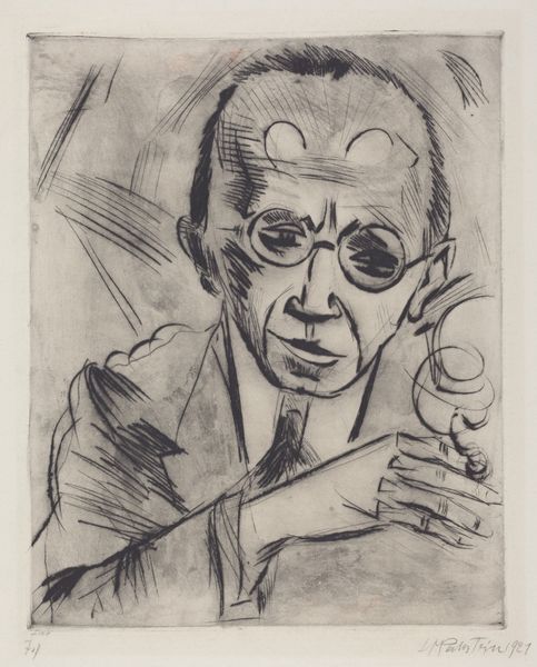 Editor: This is Max Pechstein's 1919 print of Dr. Paul Fechter. It’s a striking portrait; almost a caricature. All the lines make it look a little frantic, like you’re seeing him mid-thought. What’s your read on this piece? Curator: The energy is undeniable. Looking at this as a materialist, the lines aren't just expressive; they’re evidence of labor. The incised lines, repeated and layered, point to the artist's hand, the tools employed, and the processes of printmaking. The stark contrast speaks to a period of social and economic upheaval, yes? How do you interpret the subject's attire, given that context? Editor: It seems like fairly standard business attire, which could indicate his position. But doesn’t the exaggeration of his features suggest something less than reverence? Curator: Precisely! Consider the mass production and consumption of images at this time. Caricature democratizes representation. It was part of a visual culture that poked fun at authority and status, influencing social commentary. This print exists not in isolation, but within a larger system of image-making, distribution, and reception. The relative cheapness of prints made art affordable to wider layers of the population. Editor: That’s fascinating; seeing it as part of a larger shift in access to art. So, the choice of printmaking itself carries meaning about reaching a wider audience and engaging with social critique. Curator: Exactly. And the imperfections, those seemingly frantic lines, become not flaws but evidence of human labor, resisting the smooth perfection often associated with high art, pushing the boundaries of what “art” could be. Editor: I’m going to look at prints much differently now. It’s not just the image but how it was made and who it was meant for that tells the story. Curator: Indeed! Consider not just what we see, but how it came to be seen.