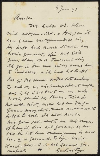 Curator: We’re looking at a fascinating document: a letter titled "Brief aan Jan Veth," created by George Hendrik Breitner. Though the exact year is uncertain, it's thought to have been penned sometime between 1892 and 1895. It’s a striking example of Breitner's drawing skills, using ink on paper. Currently, this piece resides in the Rijksmuseum collection. Editor: My immediate impression is one of intimacy. The handwriting, while neat, feels incredibly personal and direct, offering a fleeting glimpse into the thoughts of the artist. It is fascinating in its raw informality. Curator: Breitner's connection to Jan Veth is quite relevant here. Veth was a fellow artist, critic, and writer. Their relationship, as reflected in this letter, highlights the intellectual and artistic circles in the Netherlands at the end of the 19th century. This document serves as primary source material to reveal exchanges among artists that spurred artistic production. Editor: And I'm curious about the act of letter writing itself. In the late 19th century, a letter was a physical object imbued with presence, carrying emotion, and connecting sender and receiver. A physical letter held a specific weight of authenticity in ways digital communication now often lacks. What visual cues are there within the script itself that reinforce a particular message? Curator: Good question. Consider the medium—ink on paper. Breitner’s choice is telling. In an era defined by mass production and urbanization, his embrace of this hand-written form might signify a conscious choice to preserve the authenticity of human interaction and thought, at the same time that Impressionism proposed to capture a new way of seeing, linked to the speed of the modern metropolis. Editor: I'm particularly drawn to how the loops and lines create a rhythm, almost like musical notes across the page. I imagine Veth receiving this and immediately sensing the emotional landscape of the writer – from the energy in the strokes to the deliberate crossing of a t. It's a direct, unedited, imprint of thought. Curator: Analyzing this letter offers a glimpse into the dialogue of the art world during Breitner's time. The content is likely focused on aesthetic, personal, and professional interactions with contemporaries, illustrating social relationships around artistic work. Editor: For me, this image of ink on paper invites meditation. A conversation across time and artistic philosophies that, even without translation, communicates volumes about connection and intention. A very simple and compelling image that shows what a potent historical relic something as mundane as a handwritten note may be.