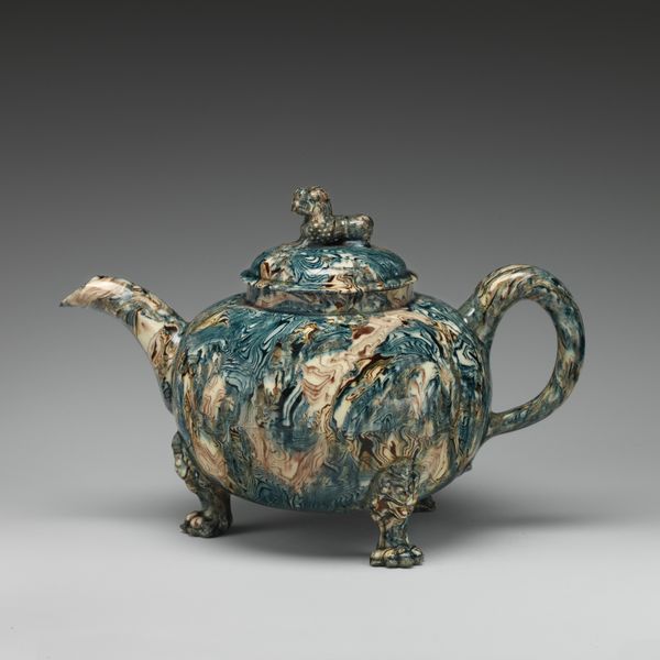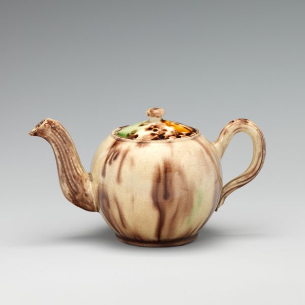 This distinctive teapot was made by a Whieldon-type pottery, probably in England in the 18th century. It's earthenware, decorated with colored lead glazes. The material itself, humble clay, is elevated here through skilled handwork. First, the body was formed, likely using molds for efficiency. Then, details like the spout and handle were added. Finally, it was coated in colored glazes, which blend and run in the kiln to create this streaked effect. Notice how the potter embraced the fluidity of the glaze, allowing it to pool and create depth. This kind of pottery was at the forefront of ceramic production, using division of labor to efficiently produce wares for a growing consumer market. It blurs the line between craft and industry, reflecting the complexities of production in the 1700s. The teapot reminds us that even everyday objects carry a wealth of material and social history.