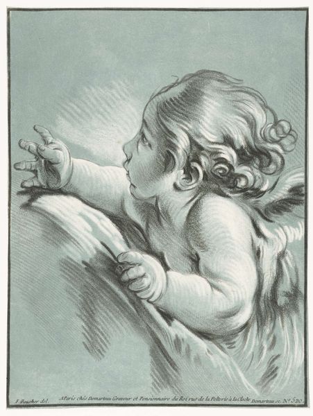 This "Putto" print was made by Gilles Demarteau, and it encapsulates many aspects of 18th century France and the social conditions which informed artistic production at that time. The image creates meaning through the putto, a classical and religious reference which had become a popular symbol in Rococo art for love and innocence. The inscription mentions that Demarteau was an engraver and "Pensionnaire du Roi," meaning he was in the service of the King. The "Rue de la Feltere" references his location in Paris. This was a time when artistic success was tied to royal patronage and membership in institutions like the Académie Royale. Artists like Demarteau had to navigate the politics of imagery and taste, creating works that catered to the elite while also participating in the burgeoning print market. Understanding this artwork requires us to research the system of royal patronage, the role of the Académie, and the market for prints in 18th century Paris. These social and institutional contexts are crucial to interpreting the image and its place in history.