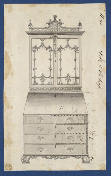 Editor: This is "Design for a Desk with Two Sets of Drawers," dating from 1815 to 1840, created by an anonymous artist. It's a drawing made with pencil, watercolor, and print on paper and it lives at The Met. It has a certain classical formality. What do you make of it? Curator: Formally, I find the precision of line and the symmetry compelling. The piece adheres strictly to a structured, balanced composition. The use of watercolor adds a layer of soft modulation to what would otherwise be a rigid depiction. How does the handling of light and shadow inform your understanding? Editor: It almost feels like the light is less about illuminating the desk and more about highlighting the form itself, the geometry, wouldn't you say? The evenness removes a sense of drama, in a way. Curator: Precisely. This evenness underscores the essence of the design—function and proportion over frivolous ornamentation. The lines are crisp; the volumes, clearly defined. There's an elegance to the piece's utilitarian intention. The use of line creates geometric divisions while shadow conveys the volumetric, the overall effect speaks to something beyond just furniture design, wouldn't you agree? Editor: I think so! Before looking closely, it just seemed like a desk drawing, but it is trying to explore ideas about structure more generally. Thanks, this was so helpful! Curator: My pleasure. Considering the artwork through a formal lens really hones in on how meaning is derived from intrinsic elements.