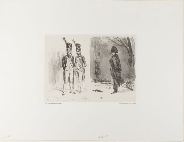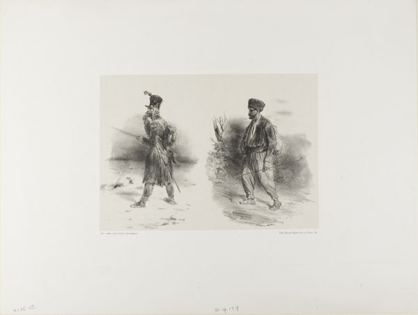 This print, titled "Twee mannen in rokkostuum met wandelstok en sigaar" (Two men in dress coat with walking stick and cigar), was made by Frans de Vadder in 1887. Through the drypoint medium, Vadder explores aspects of bourgeois identity during a time of social transformation in Europe. The men, adorned in formal attire, embody the conventions of the late 19th-century bourgeoisie, where appearances often signaled one’s social standing. However, these are not portraits, and it's their anonymity that strikes me. The scene invites us to consider the emotional landscape of men during this time. Were they confident in their roles? Or were they anxious about a quickly changing world? De Vadder's work contributes to a broader cultural conversation about masculinity, class, and the performance of identity. What does it mean to see these men—possibly ordinary citizens—depicted with such intentional ambiguity? It raises questions about who gets to be seen and how they are represented.