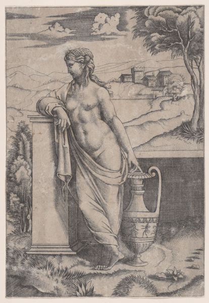Curator: This is Charles Fairfax Murray’s "Truth, after Giovanni Bellini," housed here at the Harvard Art Museums. It measures about 25 by 16 centimeters. Editor: It’s striking how Murray renders this scene in monochrome, almost like a photograph, lending it a stark, dreamlike quality. Curator: Indeed. Murray, a British Pre-Raphaelite, creates a dialogue with Bellini, invoking classical ideals of beauty and truth. Note the allegorical figure of Truth, nude and centrally positioned. Editor: She seems idealized, removed, almost untouchable, doesn't she? And the children… are they symbols of innocence, perhaps? Curator: Possibly. Or maybe they represent the various pursuits of knowledge – music, observation – all surrounding the central figure of Truth. Editor: The mirroring shield she holds is intriguing—a visual reminder that truth is often reflective and multifaceted, or perhaps easily distorted. Curator: Murray offers an exploration of how previous generations perceived ideals, and he invites his own contemporaries to consider what remains constant. Editor: It highlights art's unique ability to both preserve and reinterpret cultural values. A delicate balancing act.