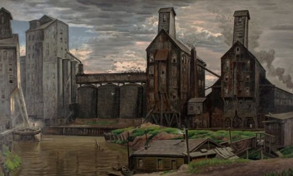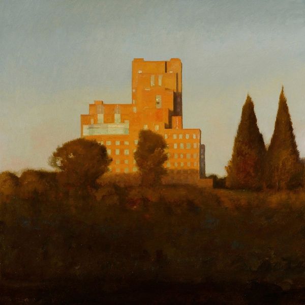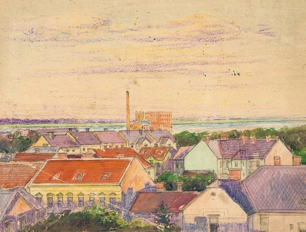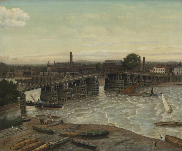Editor: This is Henri Rousseau's "View of the Outskirts of Paris," painted in 1896. It's an oil painting currently housed at the Detroit Institute of Arts. The mood feels strangely calm despite the industrial imagery; a sort of dreamlike serenity, even. How do you interpret this work? Curator: This cityscape, ostensibly documenting the urban periphery, speaks volumes about societal transformation. Notice the stark, towering chimneys juxtaposed with the placid river – what does that dichotomy suggest to you? Editor: It's like the past meeting the future, almost awkwardly. Curator: Precisely. Consider how factories symbolized progress and modernity at the time, yet the simplified forms and muted palette hark back to earlier, less industrialized times. Rousseau uses these visual cues to evoke a sense of cultural memory – an awareness of what's being gained and perhaps lost. The bridge in the distance could represent a span of time as well as a passage to new opportunities. What emotions are conjured by this unusual composition? Editor: A kind of quiet acceptance, maybe? There's no judgment, just…observation. Curator: Yes, there’s a detached, almost childlike wonder. It hints at a larger psychological theme about humanity's evolving relationship with technology and nature, themes that resonate powerfully even today. It is up to the viewers to place their experiences within its visual frame. Editor: I never considered the emotional weight behind the imagery before, viewing it just as a painting. Now, it speaks of industrial and social tensions. Curator: Precisely. Seeing deepens insight.