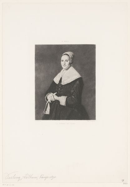 Curator: The “Portret van een onbekende vrouw,” or Portrait of an Unknown Woman, resides here at the Rijksmuseum. Created between 1847 and 1932 by William Unger, it exemplifies a compelling blend of realism through an etching on print. Editor: My immediate response is a kind of somber quietude. The tight composition and monochrome tones draw me in, but there is something so fundamentally unknowable about the subject's interiority. Curator: Precisely, this unknowability invites crucial discourse. The subject is deliberately rendered, but the absence of identification becomes a space to project narratives. Who might she have been, and what roles did she embody in the social fabric of her time? The Northern Renaissance undertones give this piece a distinctive look. Editor: I'm drawn to the textures Unger achieved with the etching technique. You can almost feel the wool of her garments, see the lace's delicate structure, and contemplate the manual labor embedded within replicating this image to the masses. This print collapses hierarchies between craft and art by highlighting material means. Curator: The material reality echoes a particular historical period defined by class structures and social roles dictating what and how people could perform identity. We could consider, too, whether this print represents how this unidentified woman wished to be perceived, and how much agency she possessed in this depiction. Editor: That material translation by Unger in rendering light and shadow and texture has given the viewer an intimacy despite a temporal and personal gap. This engraving is a historical residue, of production, a portrait's value as both an image and object. Curator: Ultimately, "Portret van een onbekende vrouw" reminds us of the rich complexity inherent in art and its potential to question and disrupt fixed notions of identity and representation, class, labor, and production. Editor: Absolutely. Its stillness contains echoes that connect historical artistic traditions to our engagement today with identity.