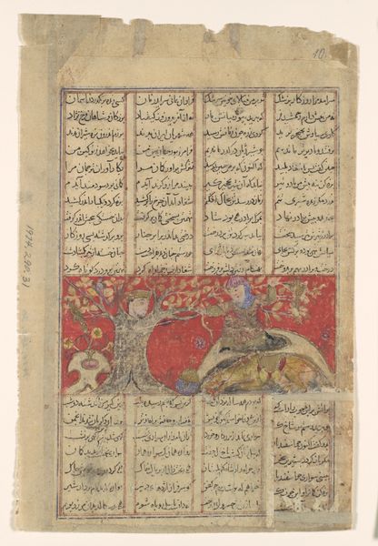 Curator: Let's turn our attention to this remarkable miniature, currently residing at the Metropolitan Museum of Art in New York. It's titled "Rustam is Thrown into the Sea by the Div Akvan," a folio originating from a Shahnama, or Book of Kings, crafted sometime between 1305 and 1365. Editor: Immediately, I’m struck by the contrasting blues of the water against the intense red backdrop. It feels dramatically staged, almost theatrical, despite the small scale. The figures are caught in such a violent, yet strangely elegant dance. Curator: Indeed, the Book of Kings, penned by Firdausi, is a cornerstone of Persian literature. These illustrated folios served not only to narrate but also to visually amplify the epic tales of ancient Persia. The figure you noted is Rustam, a legendary hero in Persian mythology. The div, or demon, Akvan, is in the process of casting him into the sea. Editor: And how cleverly the artist conveys movement! Those swirling lines and the almost geometric rendering of the waves give a sense of tumultuous energy. Also, the colours seem highly symbolic, red always evoking strength or impending conflict. I'm assuming that extends across cultures. Curator: Certainly, though here, that field of saturated red isn't merely a stage for conflict. Consider its connection to power, to kingship itself within Persian artistic and symbolic language. Remember these miniatures would have been viewed in the courts, amidst layers of coded meaning. That demonic figure throwing him has got some serious teeth too! Editor: Yes, you’re right to bring it back to the context, of course. Look at the lines of the text surrounding the image; it literally frames and contains the image, turning the episode into a gem for thoughtful observation. Curator: Precisely. And Rustam being thrown into the sea isn’t just a literal depiction but carries symbolic weight. Water, especially turbulent water, can signify chaos, uncertainty, a trial of the hero's spirit and virtue before it is revealed as true and eternal. Editor: I see what you mean. Examining how those forms interact, and appreciating the historical role of manuscript and colours creates an additional layer to this scene. Curator: Exactly. It's this intersection of artistic composition and symbolic language that elevates this from mere illustration to a potent, enduring visual narrative. Editor: Definitely. It offers much more than meets the eye upon first glance.