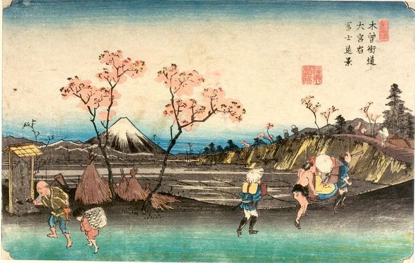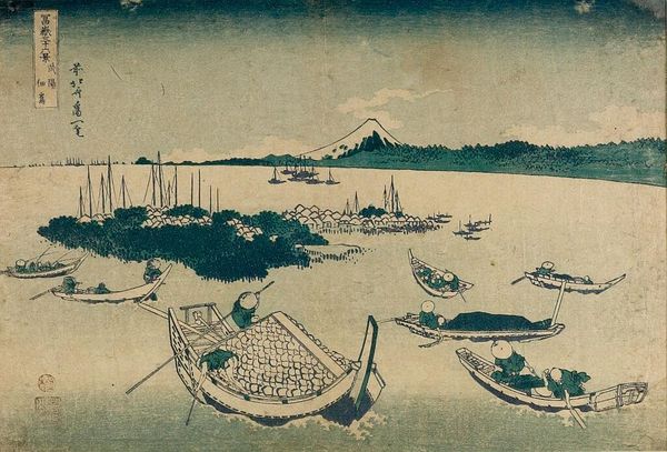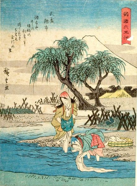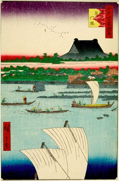 Editor: Here we have Keisai Eisen's "A Ferry Boat on the Sumida River," created sometime before 1848. It feels like a snapshot, a fleeting moment on the water. What catches your eye in this piece? Curator: It’s interesting you call it a snapshot! These ukiyo-e prints were mass-produced, capturing everyday life for a growing urban audience. I wonder, does the boatman's pole ground you, or do you find yourself drifting with the current, contemplating the pale moon? Editor: Definitely drifting, especially with the calligraphy adding to the dreamy feel. Curator: The poetry is part of the scene, an integral layer of meaning and feeling. Knowing this was for the masses makes you wonder what they saw that we miss today. Editor: That's a great point. It makes me appreciate how art reflects its time.