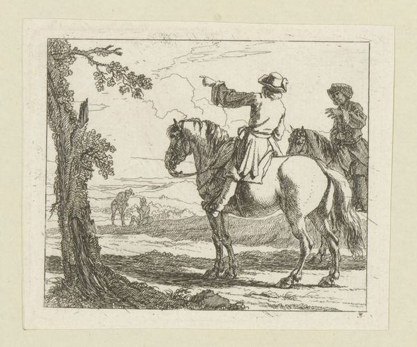 Editor: Here we have "Herders en vee onderweg" by Dancker Danckerts, created sometime between 1643 and 1666. It’s an engraving, and it strikes me as a really peaceful depiction of everyday life. What do you see in this piece? Curator: I see a window into the complex social fabric of the Dutch Golden Age. While seemingly bucolic, these images of rural life often masked deeper power dynamics. Consider the figure on the donkey pointing – what does that gesture signify in relation to those on foot leading the livestock? Is it a benign direction or something more authoritarian? Editor: That’s a really interesting point. I hadn’t considered that the pointing figure might represent a hierarchy. It’s so subtle, though. Curator: Exactly! The subtlety is key. The Dutch Golden Age was a period of immense wealth accumulation for some, built on the exploitation of others, both at home and abroad. The engraving’s idyllic portrayal normalizes this hierarchy. Are these herders merely guiding their livestock, or are they subject to the whims of a landowner or merchant? Editor: So, you’re saying that these genre scenes aren't just simple representations of daily life, but can be read as social commentary? Curator: Precisely. Consider who these images were created for, often the rising merchant class. By romanticizing the countryside, they reinforced their own social position and justified the existing power structures. What isn't shown is just as important as what is. Where is the impact of the rapidly changing economic system? Editor: I never thought about art this way. It’s really powerful to consider art as an active participant in shaping social norms, and making what might be considered wrong seem normal. Curator: It's a lens for understanding the past, and, perhaps, reflecting on our present. By critically examining seemingly simple images, we can unearth the intricate web of social, political, and economic forces that shaped their creation and reception.