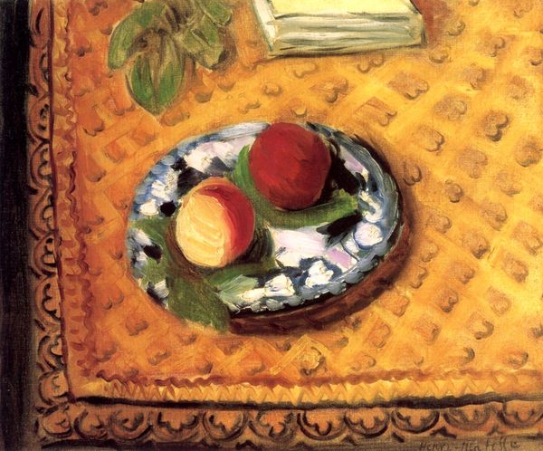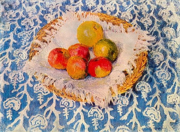 Igor Grabar painted this still life, "Blue Tablecloth", using oil on canvas. Grabar builds up the image with individual brushstrokes, each a dab of pure color. This pointillist technique really emphasizes the materiality of paint. Look closely, and you'll see the physical texture he created on the canvas. This was not simply illusionism; it was about making you aware of the work involved. This approach also reflects the rise of consumer culture. The objects depicted, like the woven basket and patterned tablecloth, are signs of a comfortable life, accessible to a growing middle class. But the painting's broken surface reminds us that even everyday beauty is constructed, the product of labor and design. By foregrounding the process of its making, Grabar elevates the status of labor, craft, and design, things that have long been considered separate from high art.