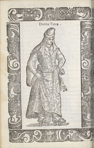 Editor: Here we have "Matrona holandesa," from 1598, by Christoph Krieger, an engraving done with ink. It feels very formal, almost austere, because of the stark lines and limited shading. What strikes you when you examine this print? Curator: Immediately, I am drawn to the interplay of textures and patterns meticulously rendered through the engraving technique. Note the contrasting linear density used to differentiate the garments, creating visual weight and spatial depth. How does the ornamental border affect your perception of the central image? Editor: I see what you mean, the border sort of frames it like a stage. It makes it seem almost theatrical, in a strange way, given that it's just two figures. I guess, in my mind, that begs the question - how are these patterns meant to play off each other? Does this visual language suggest anything about the subject of the artwork itself? Curator: The geometric rigidity of the architectural frame directly contrasts with the free-flowing, curvilinear patterns adorning the matron's gown. Semiotically, this juxtaposition highlights the tension between societal structure and individual expression. Do you find any intentional asymmetry in the composition? Editor: Now that you point it out, I notice that one woman's headdress dominates the frame more. Maybe it speaks to social hierarchy or something else specific to their cultural status. Curator: Indeed. The controlled application of line and the formal arrangement of elements are deliberate choices by the artist, intended to convey specific messages beyond mere representation. Thinking of form and content, does this shift your understanding of its narrative potential? Editor: Absolutely. I see how dissecting the visual elements, like line and texture, opens up a richer dialogue with the work, offering insights into the subject and its meaning. Curator: Precisely, the formal qualities are never arbitrary. They are always intentional.