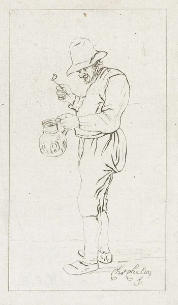 Editor: Here we have Pieter de Mare’s “Standing Woman with a Stick,” made between 1777 and 1779. It's a delicate pencil drawing on paper. The woman’s face seems kind, yet weathered. What strikes you about it? Curator: It's fascinating to consider this work from a materialist perspective. Look at the pencil, the paper – these were commodities, available to a growing merchant class. How did access to these materials shape de Mare's practice and the subjects he chose to depict? Were such implements widely available? Editor: I hadn’t thought of it that way. I suppose drawing materials weren't always accessible. It’s interesting that he depicts what looks like a working-class woman. Curator: Exactly. Her clothing, her walking stick – these are signifiers of labor and lived experience. This wasn’t some idealized mythological figure; this was a woman whose existence was tied to material conditions. The very act of portraying her in this medium challenges the hierarchy of artistic subjects and its conventions. Consider her dress; clearly, functionality outweighs high style. Editor: So, you are suggesting the drawing is less about aesthetic beauty and more about... recording a social reality through readily available materials? Curator: Precisely. The 'low' subject is rendered with newfound, increasingly commodified tools of art making. De Mare, with his pencils and paper, is participating in a changing economic and social landscape. The pencil wasn’t always taken for granted. Editor: That definitely gives me a different appreciation for the work. I am always so focused on the subject I fail to recognize its relation to labor and how raw materials enable that act. Curator: Indeed. This lens enriches our understanding.